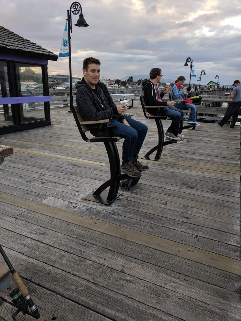 Eisessen auf der Pier im Captain Kirk Sessel (Diese sind eigentlich für Angler gedacht).